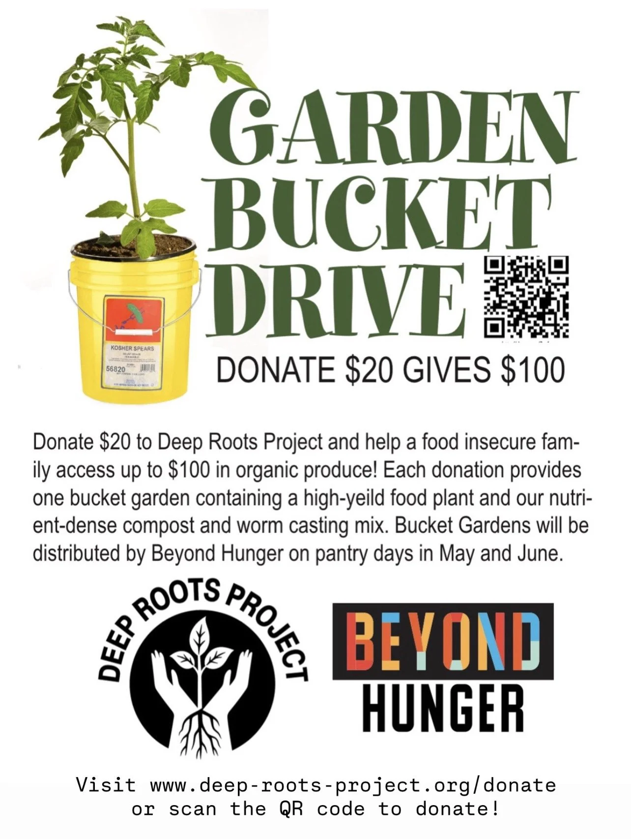 Deep Roots Project knows the value of having easy access to nutrient-dense organic produce right outside your door. We are always looking for ways to make vegetable gardening accessible to everyone, especially the food-insecure. We are so excited to be able to offer bucket gardens to Beyond Hunger’s pantry customers this season with the help of your donations!