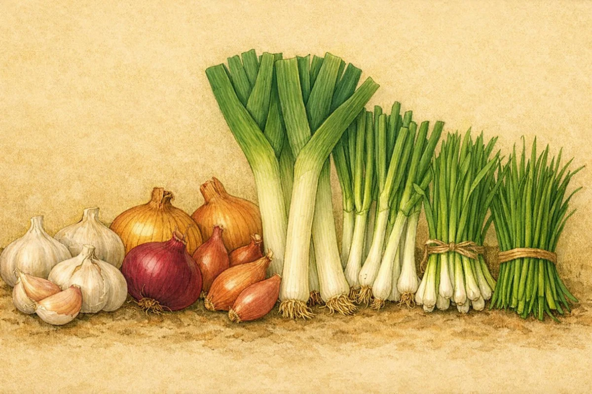 Garlic and onions are often casually grouped with root vegetables — but that is botanically incorrect. Garlic, onions, shallots, leeks, scallions, and chives all belong to the allium family: plants that grow as bulbs, which are modified stems surrounded by fleshy leaf bases. The underground bulb we harvest is not a root at all, but a tightly layered structure formed from swollen leaf bases attached to a small root plate.