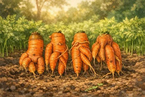 Roots store energy. Root crops aren’t trying to grow fast — they’re trying to store energy underground. Carrots, beets and parsnips only do that when they receive a specific signal that says “nutrients are present, but limited.” When nitrogen is too high — as it often is in manure-based compost — that signal never comes. Instead, the plant keeps putting energy into leaves. This is why gardeners sometimes see beautiful, bushy tops and disappointingly small roots. The plant is doing exactly what the soil chemistry is telling it to do.
